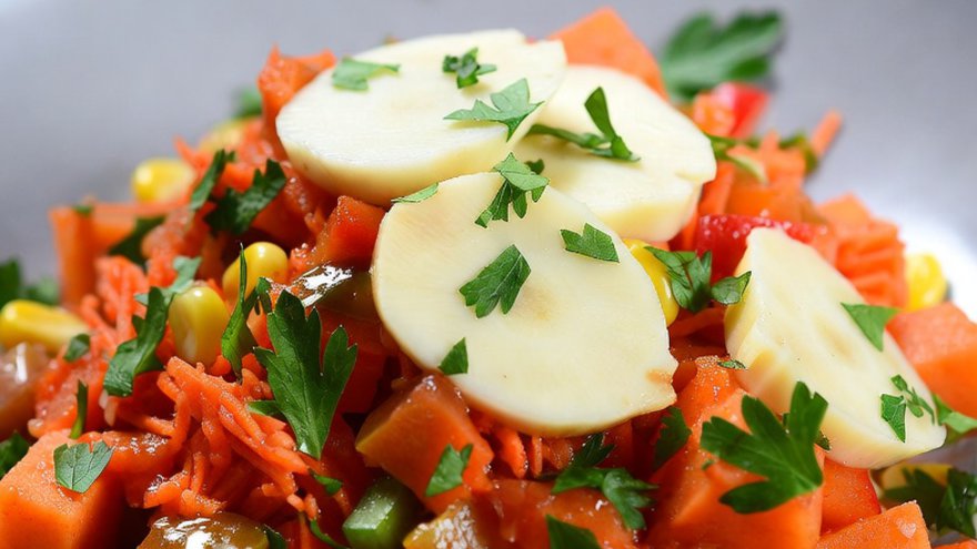 Cortar en cubos una manzana verde, la rama de apio, los palmitos y el kanikama previamente cocido.