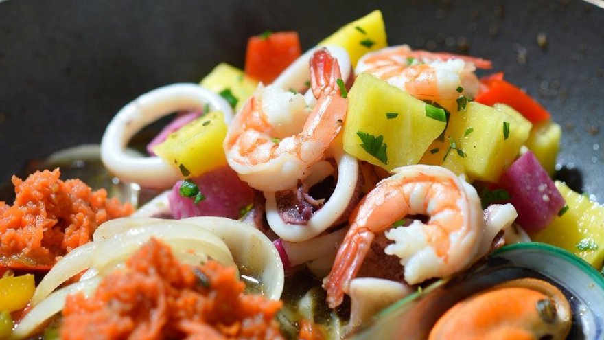 Para servir: colocar una base de lechuga cortada groseramente con las manos, exprimir unas gotas de jugo de limón encima. Colocar los camarones y los palitos kani-kama, las frutas y condimentar con sal y pimienta.