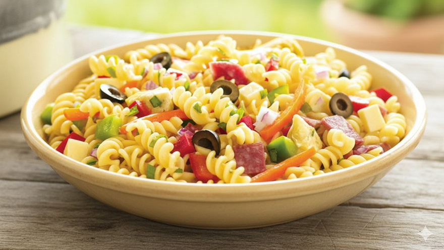 Colocar la pasta fría en una fuente honda y agregar el jamón cortado en finas tiras, el queso cortado en cubitos, las aceitunas descarozadas cortadas en rueditas y los tomates cubeteados.