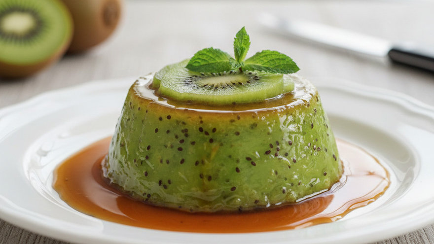Pelar 2 kiwis, cortarlos en rodajas y forrar con ellos las paredes de un molde de flan bien enmantecado.