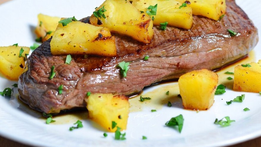 Al día siguiente se disponen los trozos de matambre en una asadera de horno, sin escurrir el jugo del ananá se le agrega sal, pimienta y ajo picado.