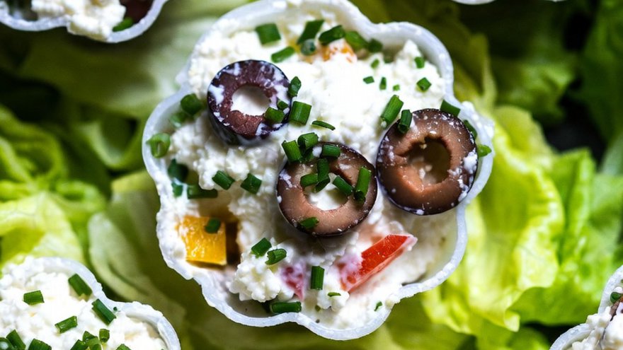 Incorporar el requesón, la ciboulette picada, el morrón picado, las aceitunas, la mostaza, sal y pimienta.