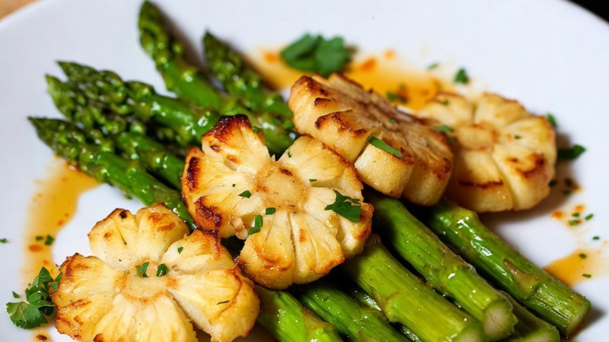 Dorar los palmitos y los espárragos sobre la parrilla.