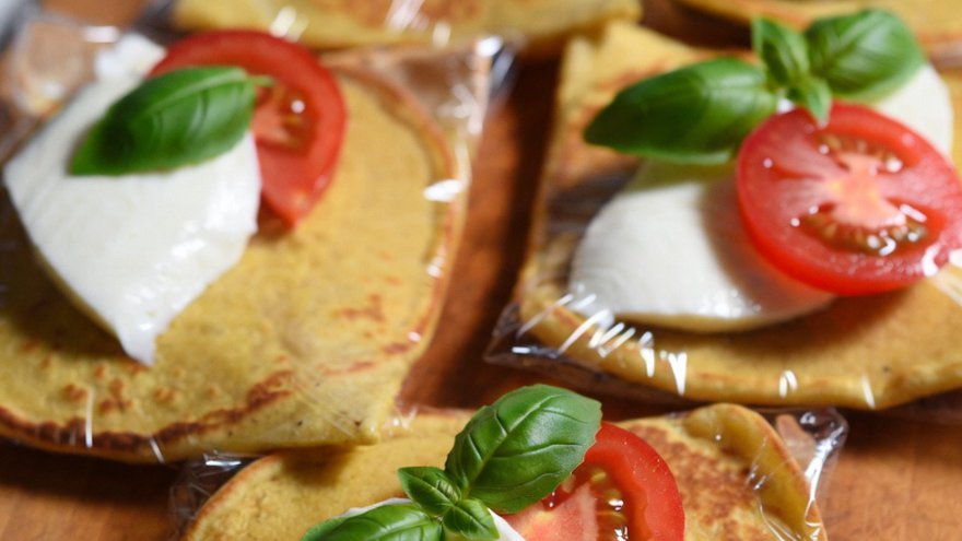 Colocar sobre cada panqueque (se pueden usar también tortillas de maíz o trigo) una feta de muzzarella, una rodaja de tomate, sal, pimienta y unas hojas de albahaca.