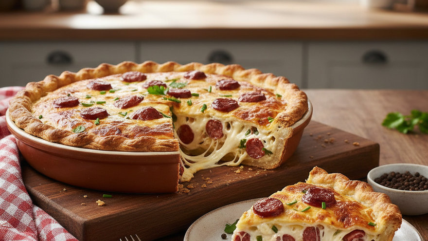 Torta de queso y longaniza: La dupla queso + fiambre es infalible; esta tarta se puede comer tibia o fría.