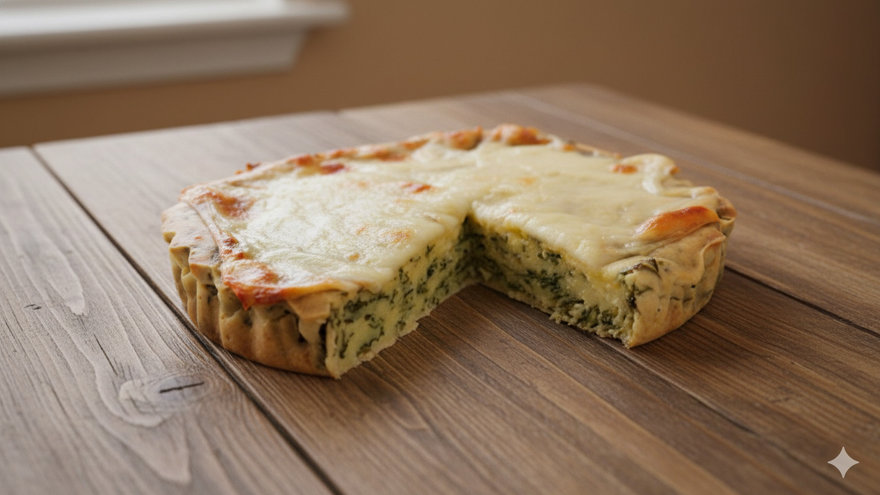 Aceitar una asadera y disponer la mitad de la masa, luego las fetas de muzzarella y por último cubrir con el restante de la masa.